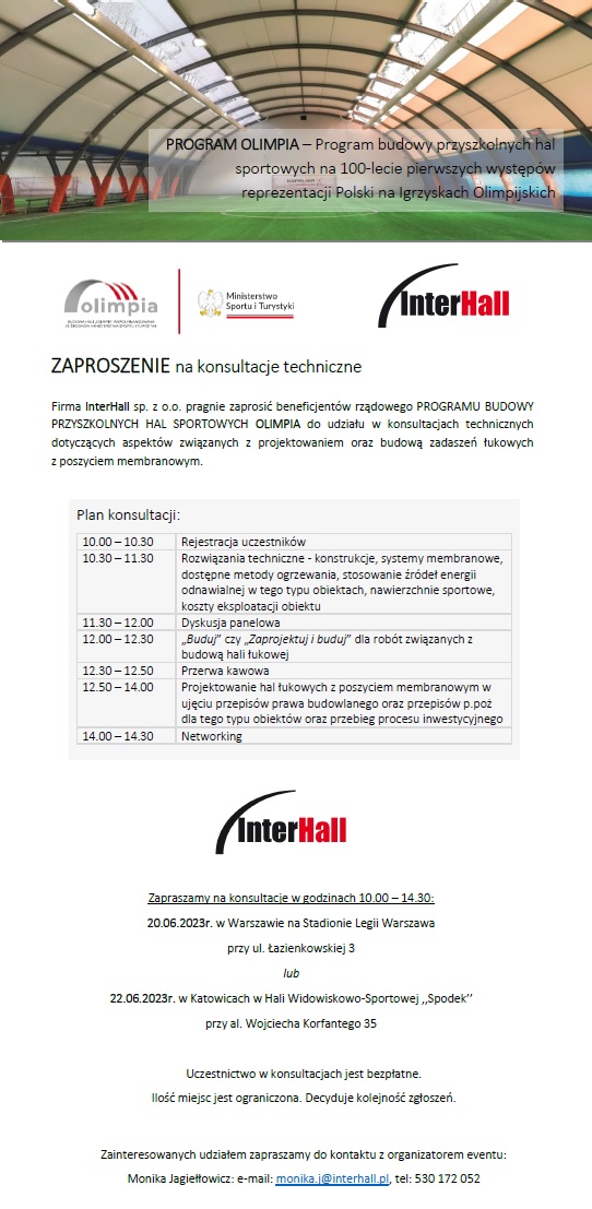 Zapraszamy na konferencję programu Olimpia, organizowaną przez Interhall. Konferencja dotyczy programu dofinansowującego obiekty sportowe takie jak hale łukowe oraz budowa boisk zawierających nawierzchnie poliuretanowe oraz nawierzchnie typu sztuczna trawa. Szczegóły poniżej.